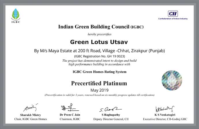 Green Lotus Utsav Zirakpur is an environmentally sustainable residential project designed for individuals who seek a luxurious yet eco-conscious lifestyle. Developed by Maya Estate, this project is certified as an IGBC Platinum Rated Project, which signifies adherence to high environmental and sustainability standards.