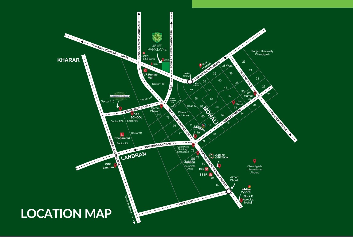 Jubilee Parklane enjoys an excellent location in Sector 120, Mohali, with convenient access to major roads and highways. The community has an approximate 500 feet frontage on NH-21, one of the main highways connecting Chandigarh and Mohali. This prime location ensures that residents have easy access to the city’s key areas, including shopping centers, schools, hospitals, and entertainment hubs.
