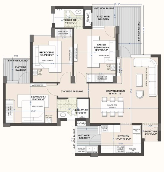 1550 sq.ft. 3BHK apartment in Airport Road, Zirakpur