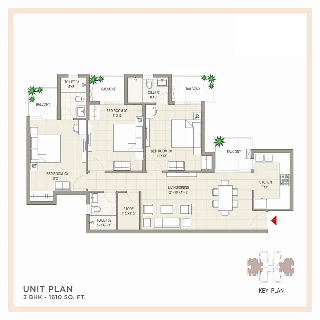 Our property boasts a contemporary design tailored to suit the lifestyle of the modern generation. From sleek architecture to chic interiors, every aspect of our property exudes elegance and sophistication. With innovative features such as 2/3 BHK mid-rise apartments, premium garden homes on the ground floor, and private terrace homes on the top floor, residents can enjoy maximum privacy and spacious living. Additionally, our three-side open apartments offer enhanced ventilation and natural light, creating a serene ambiance for residents to enjoy.