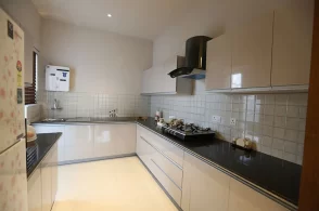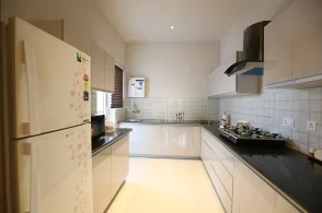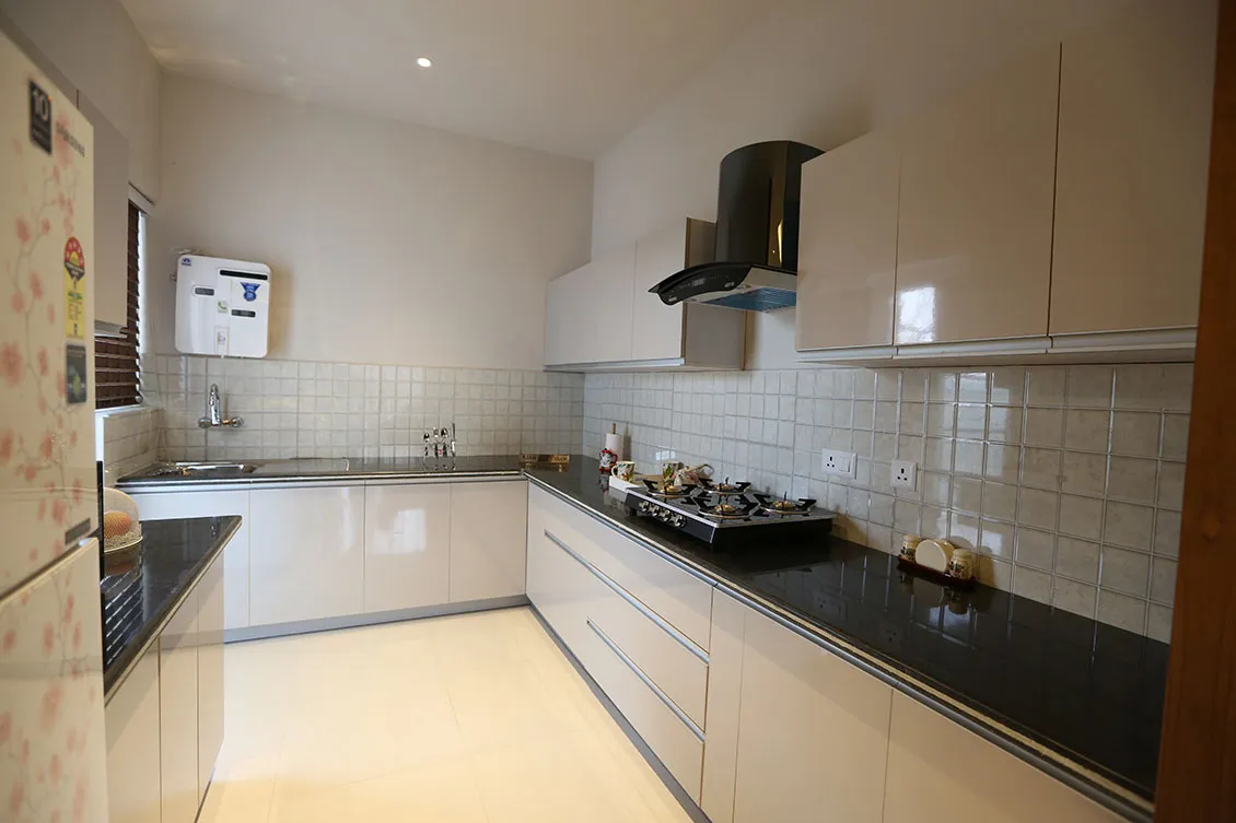 - Modern Kitchen Setup: The kitchen features a marble/granite platform with a stainless steel sink and provisions for modern appliances like a microwave and mixer grinder.