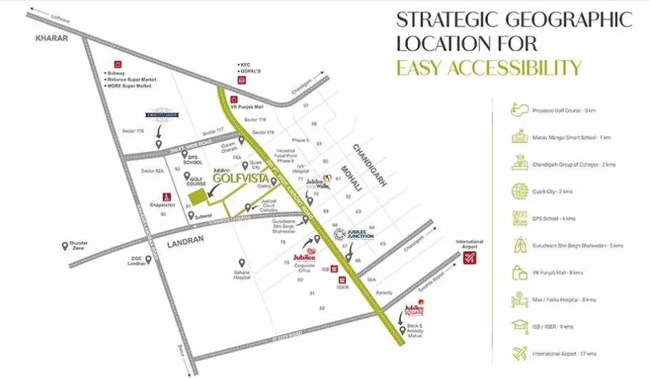 - Location Advantage: ๐ณ Adjoining the proposed Golf Course in Sector 91, Mohali, Jubilee Golfvista offers you the luxury of living amidst nature while still being close to essential amenities.