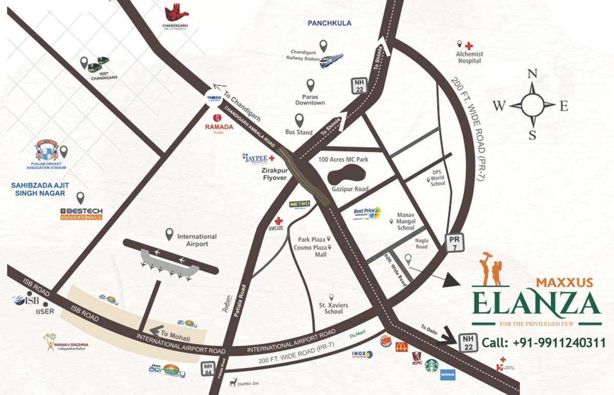 Maxxus Elanza Zirakpur boasts an excellent location, offering great connectivity to key areas in Zirakpur, Chandigarh, and beyond. Situated on the Chandigarh-Ambala Highway and Airport Road (PR-7), the project is easily accessible from major transportation routes, making commuting hassle-free. The projectโ€™s strategic location ensures that essential services and facilities are just a short drive away.