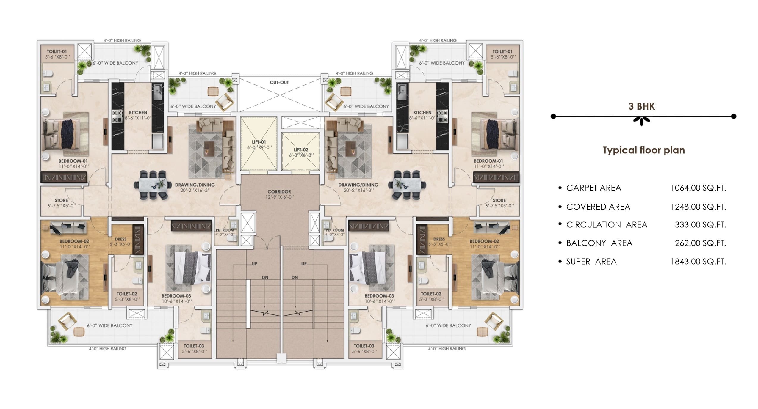 - Each tower has 2 High Speed lifts for smooth and quick accessibility.