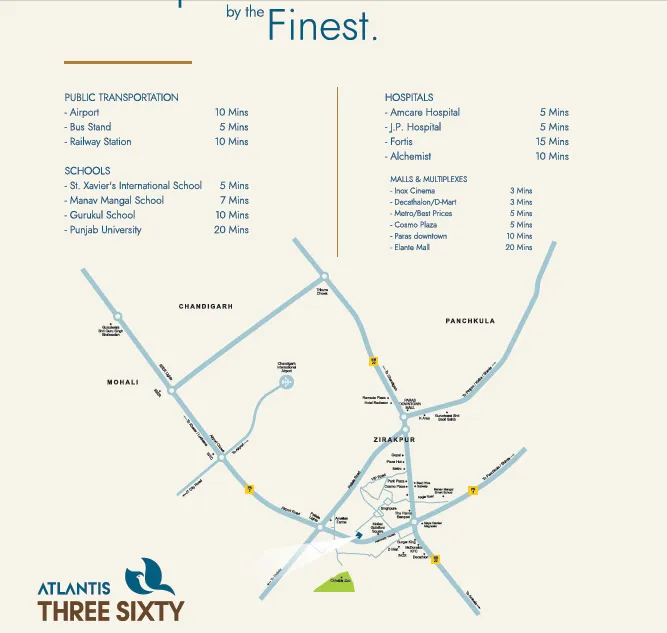 Atlantis Three Sixty is strategically located at PR-7 Highway, Zirakpur, Mohali, near Chandigarh. The location is easily accessible from several major routes, including Chandigarh International Airport, Patiala Zirakpur Highway, Chandigarh Ambala Highway, Zirakpur Panchkula Highway, and Zirakpur Shimla Highway. This prime location ensures that residents enjoy a peaceful living environment while staying connected to the bustling city life. The proximity to major highways and the airport enhances convenience and connectivity, making it an excellent choice for both residents and investors.