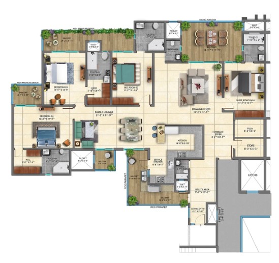 We offer a diverse range of luxurious residences, including 3+1 BHK, 4+1 BHK, Penthouses, and Luxury Earth Villas, meticulously designed to cater to varying lifestyle preferences and space requirements. Each residence is crafted to exude elegance and sophistication, promising residents a life of utmost comfort and grandeur.