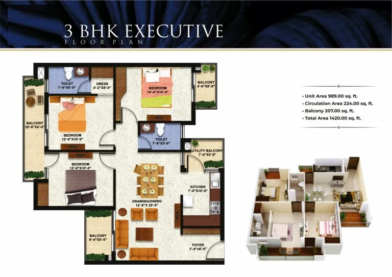 Ready to Move 1420 Sq.ft 3BHK Flat in Uptown Skylla on International Airport road – Property in Zirakpur
